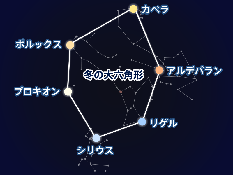 「冬のダイヤモンド」または「冬の大六角形」と呼ばれる星は
