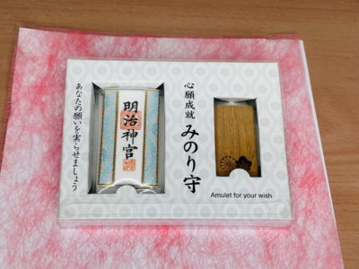 明治神宮の御神木で作られた木札に、願い事を書き入れてから身に着けます